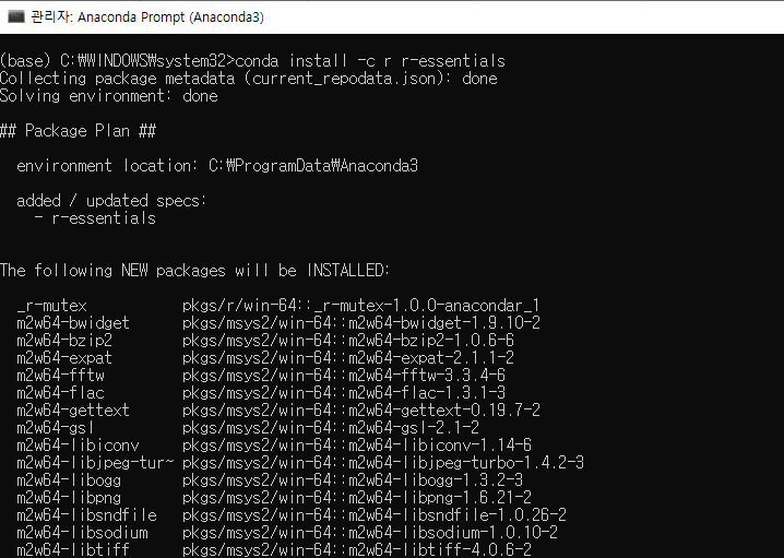 간단 요약: 관리자 권한으로 anaconda prompt 열고, conda install -c r r-essentials 실행