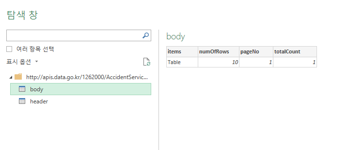 #"변경된 유형" = Table.TransformColumnTypes(Table1,{{"numOfRows", Int64.Type}, {"pageNo", Int64.Type}, {"totalCount", Int64.Type}}),