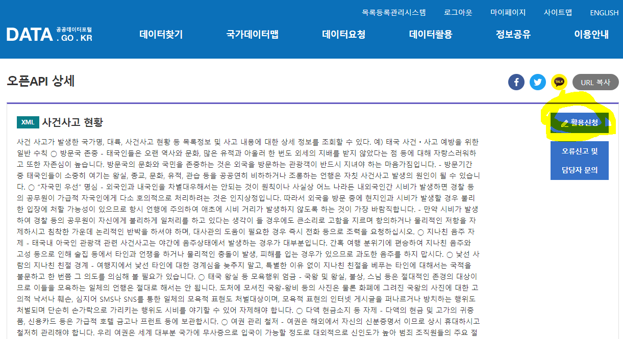 공공데이터를 사용하려면 로그인한 후 포털에서 활용신청을 클릭한다.