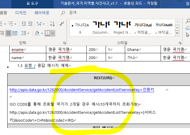 워드 내 요청이라고 검색하면 아래 REST(Url)가 존재한다.
