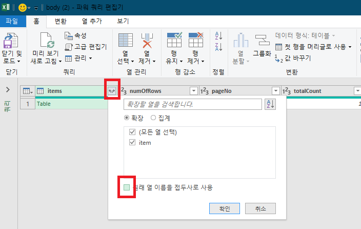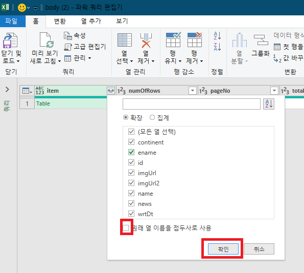 #"확장된 items.item" = Table.ExpandTableColumn(#"확장된 items", "items.item", {"continent", "ename", "id", "imgUrl", "imgUrl2", "name", "news", "wrtDt"}, {"items.item.continent", "items.item.ename", "items.item.id", "items.item.imgUrl", "items.item.imgUrl2", "items.item.name", "items.item.news", "items.item.wrtDt"})