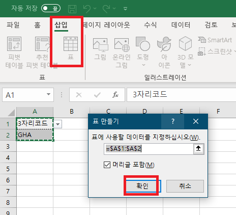다음 해야할 일은 삽입> 표 확인 클릭