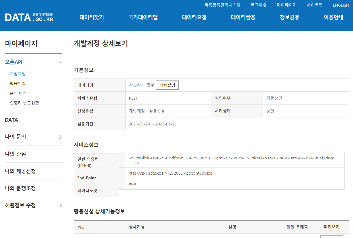 1) 하루가 지나서 그렇다. 공공데이터 포털은 딱 하루만 열어주니까 사이트 내에서 연장하기를 신청해야한다.