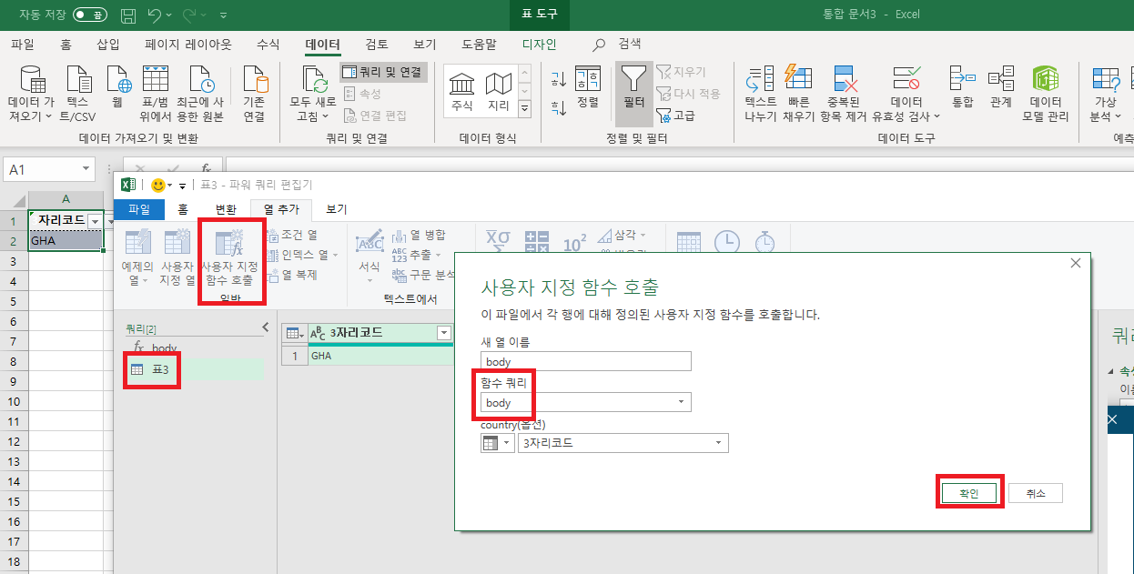 이후 열추가>사용자지정함수호출> 확인 클릭한다.