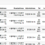 R: 영어와 한글이 섞인 컬럼에서 한글인 행만 추출하는 방법위의 컬럼중 한글 주소인 것만 궁금할때 한글인 행만 추출하고 싶다. library(stringr);library(dplyr)kr_address=AGNCINFO%>%filter(grepl("[가-힣]", AGNCINFO$address)) 먼저 grepl("[가-힣]", AGNCINFO$address)는 address라는 저 컬럼에서 한글인 것만 추출하는 것이고 filter를 통해 새로운 데이터 프레임으로 생성했다. 결과값은 아래처럼 나온다.